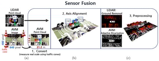 Figure 3 shows that the process of sensor fusion. The AVM sensor data has an image data format of pixels and is converted to a point cloud of size m. The actual distance of the AVM image was measured empirically by putting the traffic cones at the edge of the image as shown in Figure 3a. The size of the AVM sensor, m, is a specific value and can be varied depending on the sensor configuration. The LiDAR data has a 3D point cloud data format of . To maintain an identical dimension to the LiDAR sensor, the AVM data is converted into format. The converted AVM data is aligned with the LiDAR data based on the LiDAR coordinate system such as in Figure 3b. Axis alignment was performed manually and fifty samples of AVM/LiDAR sensor data were used for accuracy.