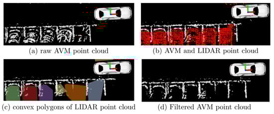 Additional preprocessing algorithms are executed on the sensor fusion data to extract a parking line feature. First, the adaptive binarization algorithm is applied to the AVM data in order to obtain the parking line markings in the parking lot. Then, the LiDAR data is transformed into a ground-removed point cloud data by applying Autoware’s space filter [] as shown in Figure 3c.