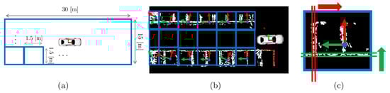 After acquiring filtered point clouds, we should extract the parking line features. To extract the parking line features exclusively, the registered data is divided into areas of 1.5 × 1.5 m considering the size of one parking space, as shown in Figure 5a. The detailed process is as follows: