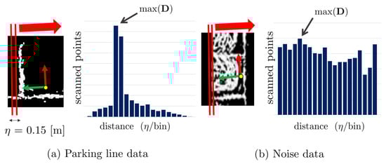 First, the method of the characteristic of the maximum number of scanned points is presented in Figure 6. In the case shown in Figure 6a, the number of scanned points at a certain distance that contains the parking line data tends to be larger than that of the other distance. Here, the maximum number of scanned points of the distance tends to be larger than the sum of the mean and two times the standard deviation . Then, the data corresponding to the distance is obtained as a parking line feature. In contrast, in Figure 6b, the maximum number of scanned points tends to be equal to or smaller than . Then, this data distribution is considered as an outlier, and no corresponding data is extracted as a parking line feature. Secondly, kurtosis is also used as a criterion to extract parking line features. Kurtosis is a statistic component that indicates the data’s sharpness. Kurtosis of the normal distribution is three. When is a set of data, kurtosis can be obtained as follows: