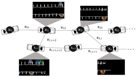 represents the rotation matrix and represents the translation vector. represents the expected measurement of two nodes, and represents the covariance matrix between two nodes. Finally, represents the squared Mahalanobis distance when the covariance matrix is . The illustration of the pose graph SLAM is shown in Figure 7. The black circle and solid line represent the vehicle pose (node) and the constraint (edge), respectively.