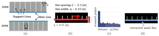 (a) Graphical image of parking spaces. Both the main line and support line are defined arbitrarily. The thickness of the support line is already specified as m, and the size of the parking space is specified as m in our parking environment. The parking line specification is determined by the Korean Parking Act and can be changed according to the country or region. (b) Scan the data distribution of the main line. (c) The histogram shows the data distribution of the main line. The bin of the main line tends to be longer than those of the other locations. (d) The main line is extracted by selecting the maximum bin in the histogram.