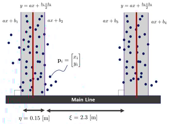 Finally, the location of the support line perpendicular to the main line should be estimated to detect a parking space. The optimal position of the support line can be obtained by optimizing the error using the least squares method, as shown in Figure 9. The following least squares equation can be used to determine the optimal position of the support line: