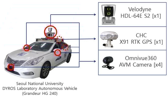 Sensor configuration of the autonomous vehicle. The autonomous vehicle of Seoul National University Dynamic Robotic System (DYROS) Laboratory was used.