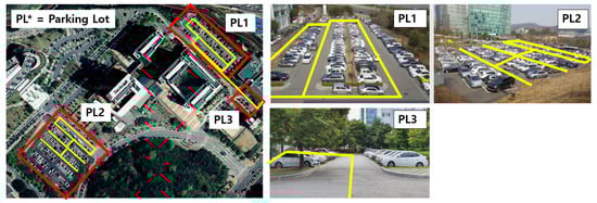 The experiments were conducted in three outdoor parking lots of the Advanced Institute of Convergence Technology located in Gwanggyo-dong, Suwon city (Figure 11). The vehicle moved at an average speed of 8 (km/h) in the parking lot. The PC used in the experiment was an on-board PC (Intel i7-8700, 16 GB of RAM) mounted on the vehicle. Real-time performance was achieved by using a CPU without a GPU. In addition, a robotic operating system (ROS) [] was used for algorithm development and visualization.