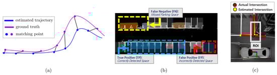 Details of performance measuring criteria for SLAM trajectory evaluation and parking space detection. (a) Process of evaluating absolute trajectory error (ATE). (b) Meanings of true positive (TP), false negative (FN) and false positive (FP) in our experiment. (c) Actual intersection and estimated intersection for measuring accuracy of parking space.