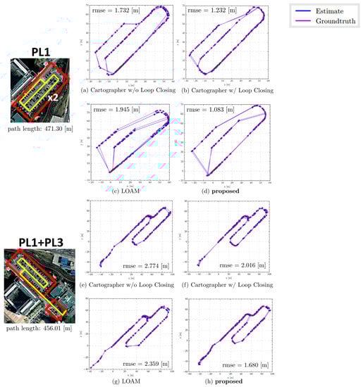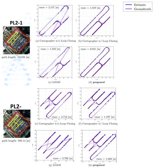 Table 1 presents the result of the experiments performed at the three parking lots. In PL1, the proposed method obtained the smallest root mean square error (RMSE) 1.083 m at a total path length of 471.30 m. Moreover, the proposed method obtained a mean of 1.003 m, median of 0.938 m, and standard deviation of 0.415 m, which are also the smallest among the methods. In case of the maximum and minimum errors, Cartographer w/LC obtained the smallest error with 2.384 m and 0.009 m, respectively.