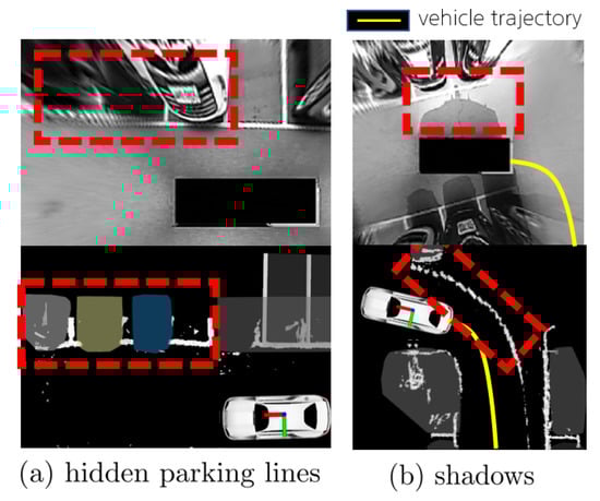 In the case of the parking space detection experiment, the average recall and precision obtained were over 97%, which can be considered high. However, the remaining 3% has to be overcome. In order to achieve more reliable performance, the major reasons of the performance degradation need to be discussed. Figure 15 shows the two main factors impacting performance degradation. As shown in Figure 15, the performance deteriorated significantly when the parking lines were concealed by vehicles and when there were shadows.