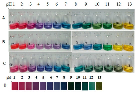 Furthermore, the resulting absorption spectra for the colorimetric pH sensor film in different pH buffers solution (pH 1–13) demonstrated the maximum absorption display wavelength (λmax) at 530 nm for pH lower than 4.0 (Figure 2D). These can be concluded that when the absorbance value decreases, pH also tends to increases and resulting in the color of the film changing from red to purple. Moreover, a new peak at 570 nm appeared when the pH of the sensing film increased to 5, 6 and 7. The absorption peak at 620 nm was found at pH 8.0 and above. Meanwhile, the absorption intensity of 620 nm increased when the solution pH increased from pH 8.0 to 10.0 and the color of sensing film changed from blue to green as shown in Figure 1B. However, no absorption peak wavelength is found in the wavelength range of 450–800 nm at pH 13.0. It may be caused by the degradation of anthocyanin compound at extreme pH values. According to Giusti & Wrolstad [], the isolated anthocyanins are highly unstable and very susceptible to degradation where their stability is very much dependent on pH value.