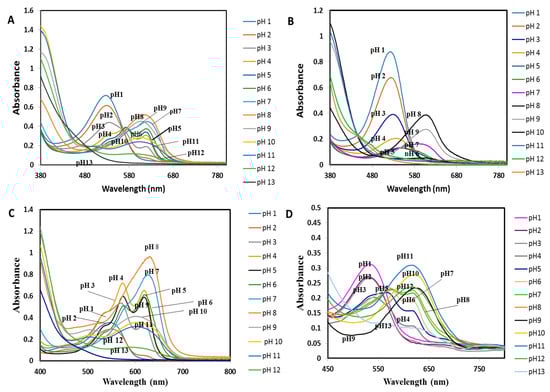 UV-vis spectra of the non-immobilized dye extracts of (A) mixed natural dyes (Brassica sp + Clitoria sp); (B) Brassica sp; (C) Clitoria sp; and (D) Colorimetric pH sensor film in different buffers (pH 1–13).