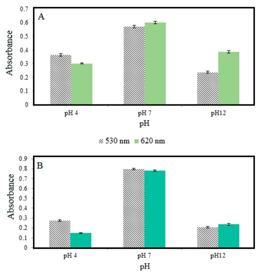 The repeatability of colorimetric pH sensor film was studied using three different buffers consists of pH 4, pH 7 and pH 12 and measured using UV–vis spectroscopy by referring at UV adsorption values. The results obtained are shown in Figure 3A for both wavelengths 530 nm and 620 nm. As a result, the relative standard deviation (RSD) values were obtained at pH 4, pH 7 and pH 12 was 2.26%, 1.64% and 2.85% (absorption at 530 nm wavelength), respectively. While RSD values obtained at the same pH was 1.40%, 1.55% and 2.06% for the 620 nm wavelengths, respectively. All of these RSD values can be described as a low and acceptable which indicates homogeneously dispersed between a mixture of natural dye and thickness of the colorimetric pH sensor film.