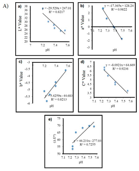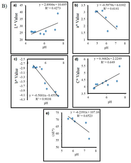 Quantitative data on the linear relationship between color parameters (L*, a*, b*, C* and ΔE*) and pH.