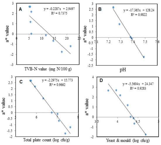 Correlation between a* value of colorimetric pH sensor film with parameter analysis of shrimp samples—(A) TVB-N concentration; (B) pH value—(C) Total plate count (TPC); (D) Yeast and mold counts.