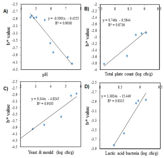 Correlation between b* value of colorimetric pH sensor film and parameter analysis of durian samples—(A) pH value; (B) Total plate count—(C) Yeast & mold counts; (D) Lactic acid bacteria counts (LAB).