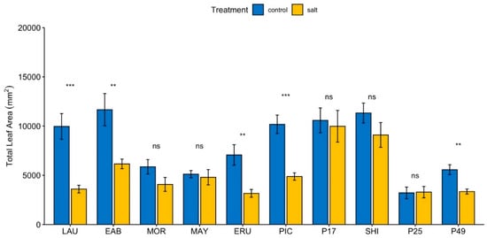 Effect of salinity on lettuce leaf area. Total leaf area was calculated using the PlantScreen phenotyping system. Values are means of two independent experiments, each with at least four biological replicates. Bars represent standard errors; asterisks indicate statistical significance as calculated by the t-test. * (p ≤ 0.05), ** (p ≤ 0.01), *** (p ≤ 0.001), **** (p ≤ 0.0001), ns = not significant (p > 0.05).