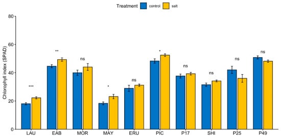 Effect of salinity on chlorophyll index in lettuce leaves. The chlorophyll index (SPAD) was measured from the same relative area from five leaves of similar age from each plant and averaged for one reading. Values are means of five independent experiments, each with at least four biological replicates per cultivar/accession per condition. Bars represent standard errors; asterisks indicate statistical significance as calculated by the t-test. * (p ≤ 0.05), ** (p ≤ 0.01), *** (p ≤ 0.001), **** (p ≤ 0.0001), ns = not significant (p > 0.05).