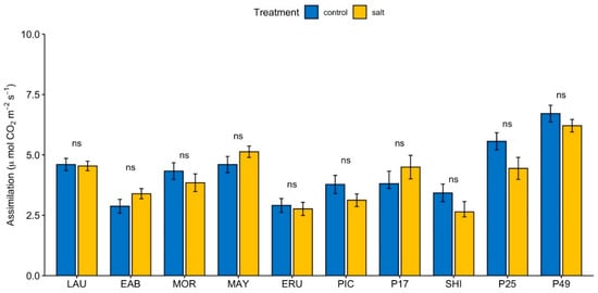 Effect of salinity on photosynthetic CO2 assimilation. Measurements from three intermediate-aged leaves from each plant were averaged for one reading. Values are means of four independent experiments, each with at least four biological replicates per cultivar/accession per condition. Bars represent standard errors; asterisks indicate statistical significance as calculated by the t-test. * (p ≤ 0.05), ** (p ≤ 0.01), *** (p ≤ 0.001), **** (p ≤ 0.0001), ns = not significant (p > 0.05).