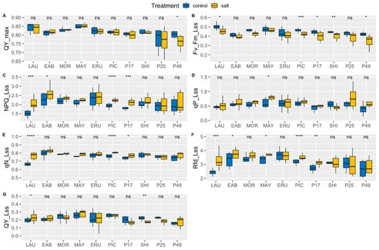 Analysis of chlorophyll fluorescence in salinity treated lettuce leaves. Chlorophyll fluorescence was measured using the PlantScreen phenotyping system and the FluorCam accessory. Values are means of two independent experiments, each with at least four biological replicates per cultivar/accession per condition. Fv/Fm or maximum quantum yield (QY_max) (A); Fv/Fm in steady state light (Fv_Fm_Lss) (B); non-photochemical quenching of maximum fluorescence in steady-state light (NPQ_Lss) (C); photochemical quenching in steady-state light (qP_Lss) (D); non-photochemical quenching of variable fluorescence in steady-state light (qN_Lss) (E); relative fluorescence decline in steady-state light (Rfd_Lss) (F); instantaneous photosystem II quantum yield in steady-state light (QY_Lss) (G). In above box plots, the boundary of the box closest to the x-axis indicates the 25th percentile, a black line within the box marks the median, and the boundary of the box farthest from the x-axis indicates the 75th percentile. Whiskers above and below the box indicate the 10th and 90th percentiles. Asterisks indicate statistical significance as calculated by the t-test. * (p ≤ 0.05), ** (p ≤ 0.01), *** (p ≤ 0.001), **** (p ≤ 0.0001), ns = not significant (p > 0.05).