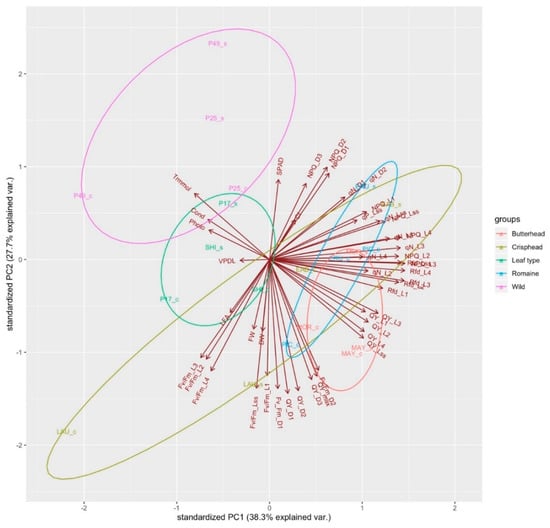PCA was conducted on all the physiological, morphological, and chlorophyll fluorescence variables together with all the treatments and genotypes (Figure 5). PC1 and PC2 account for 66% of the variance. Wild, leaf type, butterhead, and romaine lettuce form their own distinct clusters, whereas crisphead is more centrally distributed. Most of the variation in wild lettuce can be explained by high values of photosynthesis, stomatal conductance, and leaf transpiration, while most of the variation in leaf type can be explained by high values of photosynthesis, stomatal conductance, leaf transpiration, and low values of VpdL, Fv/Fm_L2, L3, L4, and total leaf area (Figure 5).