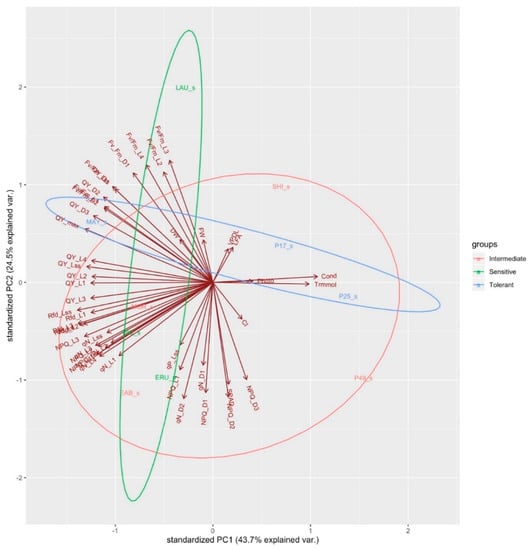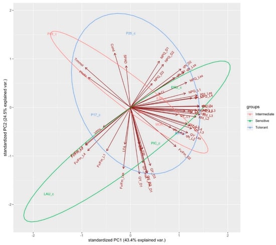 Principal component loading plot and scores of PCA on morphological, physiological, and chlorophyll fluorescence parameters of sensitive, intermediate, and tolerant genotypes grown under control conditions, grouped by colored ellipses.