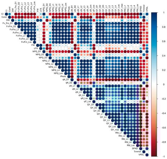 Graphical representation of a correlation matrix of morphological, physiological, and chlorophyll fluorescence parameters between sensitive cultivars “Laura”, “Eruption”, and “Parris Island Cos”, highlighting the most correlated variables. Blue color represents positive correlation whereas red represents negative correlation. Color intensity and size of the circle are proportional to the correlation coefficients which are depicted in the legend to the right.
