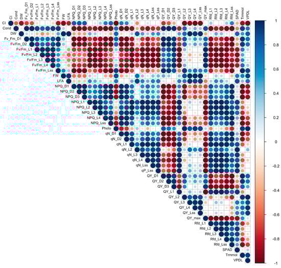 Graphical representation of a correlation matrix of morphological, physiological, and chlorophyll fluorescence parameters between tolerant genotypes PI 253468, PI 171676a, and “Mayfair”, highlighting the most correlated variables. Blue color represents positive correlation whereas red represents negative correlation. Color intensity and size of the circle are proportional to the correlation coefficients which are depicted in the legend to the right.