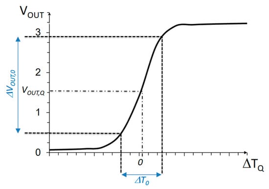 The measurement procedure for the sensor solution described above would then consist of setting the digital code n in such a way that the output voltage is moved into the linear region of the transfer curve (coarse tuning), and then, the voltage deviation from the quiescent value ΔVOUT = VOUT − VOUT,Q (fine measure) is measured. From Equation (13), the actual temperature gradient ΔTQ in the circuit can be obtained from n and ΔVOUT as follows: