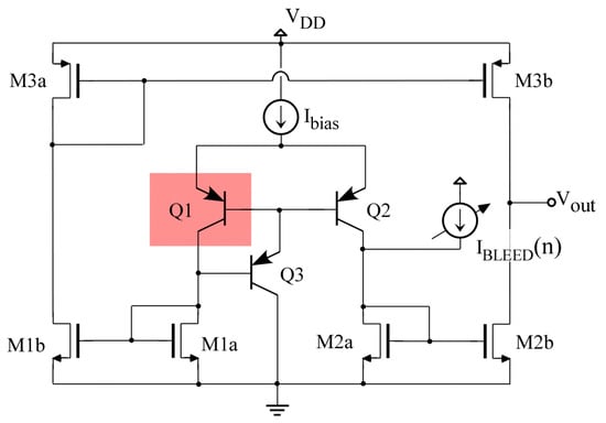 Figure 3 shows the schematic of the core sensor [26]. The working principle of the sensor is as follows: Q1 and Q2 are bipolar transistors acting as temperature transducers, producing a current that depends on their temperature difference. If both transducers Q1 and Q2 are at the same temperature, the currents that flow through each branch of the differential pair are identical. Currents are then copied to the output branch through the current mirror structures M1a-M1b, M2a-M2b and M3a-M3bA. If mirrors are perfectly matched, then the current injected by transistor M3b is equal to the current sunk by M2b, and the output voltage is preserved at its quiescent value (nominally VOUT,Q = VDD/2). Transistor Q1 (gray area) is placed by the CUT and then away from Q2 and the rest of the sensor. A temperature imbalance ΔTQ = TQ1 − TQ2 produced by heating Q1 generates a mismatch in these currents, IQ1 − IQ2 = ΔIQ, and the current mirrors translate that current imbalance into variations of the output voltage. With KM being the gain produced by the current mirrors and ROUT the small-signal resistance at the output node, output voltage variations can be related to the temperature difference through the expression [23]: