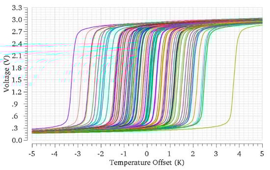 The above explanation of the sensor operation starts from the assumption that, when both transducers are at the same temperature (ΔTQ = 0 K), the core circuit is balanced and the output voltage is the targeted VOUT,Q. Unfortunately, in practical implementations, this will rarely happen. On one side, variability associated to the manufacturing process will produce mismatches between transconductors Q1 and Q2, or between the transistors in the different current mirrors. These mismatches will produce current imbalance in the output branches and thus offsets in the transfer curve, which can drive the sensor out of its linear region even if ΔTQ = 0 K. IC manufacturers provide statistical models of component variability, and this way, they can be accounted for during the circuit design. As an example, Figure 8 shows several characteristic curves obtained after simulation of the core sensor in Figure 6, with ΔTQ = 0 K, for 100 occurrences of the random variations of the components in the circuit, for an ambient temperature of 300 K. Note, how the range of variability (referred to the input) is much larger than the linear range of the sensor ΔT0; thus, the sensor output can easily be saturated at balance.
