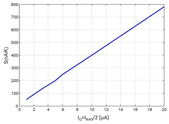 Design of the temperature sensor starts with the core circuit in Figure 3. The main target for this core sensor is to maximize its sensitivity, while achieving reasonable dynamic performance (slew-rate and bandwidth). As shown in Equation (11), sensitivity depends on the thermal transconductance produced by the bipolar transistors, SBJT = ΔIQ/ΔTQ, the gain KM of the current mirror structures, and the small-signal output resistance ROUT. The 0.35 μm technology selected only allows lateral PNP bipolar transistors with the dimensions already set, thus the only tuning value for the bipolar transistors is the DC-bias current, set by current source IBIAS in Figure 3. Figure 9 shows how BJT thermal transconductance increases linearly with the DC current, and can be quantified as SBJT ≈ IQ·40 nA/K, with current IQ expressed in μA.