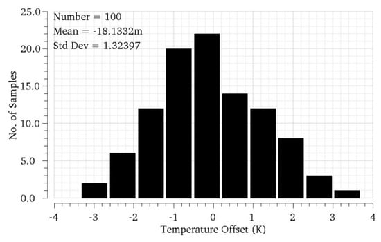 As stated in Section 3.4, bleeding currents should also compensate the effects of random manufacturing variability and other offset sources. In order to estimate the amount of offset produced by manufacturing variations, Monte-Carlo simulations of the core sensor in Figure 3 have been performed at TQ1 = TQ2 = 300 K, using MOS variability models provided by the manufacturer (process and mismatch). Note these mismatch models ignore the actual significant distance between transconductors Q1 and Q2 and thus may produce somewhat optimistic results. Figure 11 shows the histogram of the input-referred offsets in the characteristic curve obtained after 100 simulations of the circuit. The obtained histogram can be approximated to a Gaussian probability distribution with standard deviation σ = 1.33 K. In order to compensate manufacturing variability with a 99.99% yield, bleeding currents should cover offsets within ±3.9σ, which is about ±5.2 K. Note, this variability offset correction is in addition to the +10 K maximum temperature variation expected from the operation of the PA. Overall, bleeding currents should be designed to produce offsets from −5.2 to +15.2 K, with a 0.0 2K resolution.