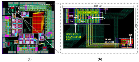 Figure 14 shows the layout of the IC designed, together with a detail of the PA and the core of the temperature sensor. The overall integrated circuit has an area of 2000 μm × 2000 μm and includes several instances of the CUT and sensors, as well as output buffers and auxiliary circuitry. The white square in the detailed view of the layout highlights one of the 38-unit cell transistors that constitute PA transistor MPA in Figure 12. To guarantee controlled current densities, these devices are placed in a matrix-like way (four rows and 10 columns). There are two voids within this matrix: row 3, columns 6 and 7. In this area, we have placed the bipolar transducer Q1. This bipolar transistor is a parasitic lateral PNP transistor, whose layout and model are provided by the design kit. Transistor Q2 is in the lower-right corner of the rectangle. This device placement implies that when the PA transistor dissipates power, transistor Q1 will always be hotter than transistor Q2.