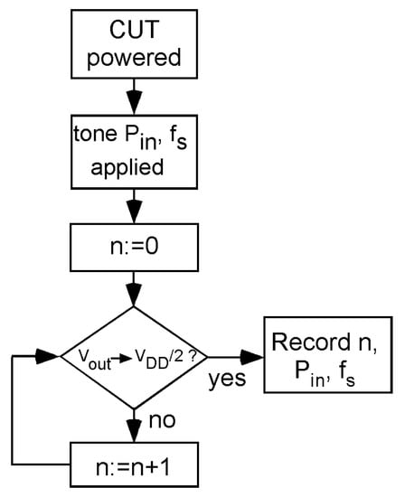 In this equation, the quantitative power variation corresponding to the difference between n and n’ depends on the sensitivity of the bipolar transistor and on the thermal coupling resistance that, although they were estimated with simulation analysis, are not precisely known for each IC sample. Depending on the characteristic of the CUT to be monitored, this may require an additional previous characterization step. For example, to obtain—and monitor—the central frequency of this RF amplifier, obtaining the quantitative power is not necessary. Simply, the algorithm in Figure 15 would be applied for several input frequencies fs, with the purpose to identify the frequency at which the maximum n is produced [10]. On the contrary, if the RF output power is to be monitored, the quantitative relationship between the actually dissipated DC power in the CUT and the sensor reading is necessary. To obtain this relationship, a one-time previous characterization of the PA-sensor system would be required, simply measuring the sensor output for several DC power dissipations in the PA.