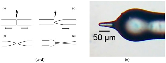 The optical fiber micro-cantilever was produced by the following step in Figure 1a, in which the fusion of two cleaved fibers (with a duration of 10 s and a power of −40 a.u.) is presented and simultaneously applied a tension in the fibers; the final results are two fiber tips (Figure 1b), for the sensor only needs one fiber tip. In the Figure 1c, the fusion between a cleaved fiber and the fiber tip (with a duration of 10 s and a power of −40 a.u.) is shown. During the fusion, the fiber tip was under tension. The result was a narrow fiber tip (Figure 1d). In addition to the formation of the narrow fiber tip, a microsphere was formed and did not influence the performance of the sensor.