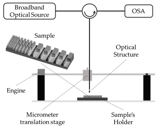 The sensitivity of the sensor in the detection of a surface profile in the contact mode is characterized. For this proposal, the setup of Figure 2 was used, and the grid features are shown in Table 1. The sensor was fixed by the optical fiber. The characterization began with the moving down of the optical fiber until the fiber tip contacted the grid elevations, causing a variation in the optical signal intensity. The fiber was moved to one of the grid ends. Finally, by means of the motor, with an average minimum speed of 3.75 mm/s, the fiber was moved along the grid. Thus, the curvatures to which the fiber tip will be submitted will not deform the fiber tip.