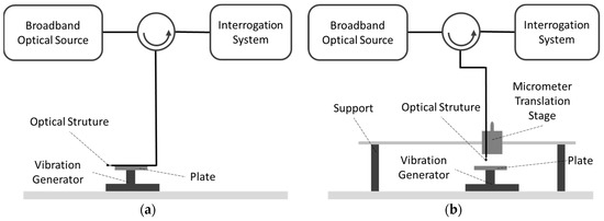 The optical fiber micro-cantilever sensor was studied when it was subjected to vibration. Figure 4 presents two setup configurations for two different sensor positions (parallel and perpendicular) in relation to oscillating plate. This oscillating plate was dark and was coupled with a vibration generator. As shown inn Figure 4a, the sensor was fixed to the plate by the optical fiber. The sensor was located outside the plate at 27.5 mm. As shown in Figure 4b, the sensor was fixed by the optical fiber in the micrometer translation stage and the contact with the oscillating surface was made by the fiber tip.
