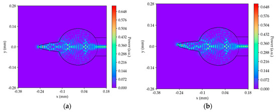 As shown in Figure 6a, the fiber tip was straight, which resulted in the formation of a symmetrical mode in relation to the fiber tip axis. As observed in Figure 6b, there was a change in the modes inside the curved fiber tip and the microsphere modes remained constant. Therefore, the performance of the sensor depended mainly on the fiber tip and the microsphere did not influence the sensor’s performance.