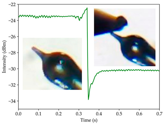As described at the end of Section 2, the optical paths were mainly influenced by the tip. Figure 7 shows that when the tip was curved there was a variation in the optical output signal. In this case, the tip reached an angle of 2.5°, which resulted in a signal decrease of 7 dB. Thus, the sensor was very sensitive to the variation of the tip curvature. The decay time was 6 ms. This value corresponds to the response time of the system, to which the optical sensor was subjected.