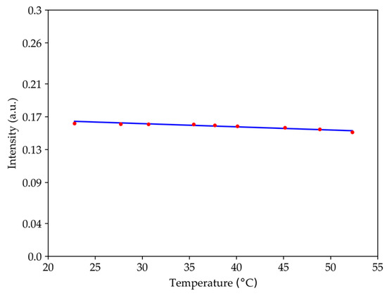 For this section, the assembly of the temperature setup of Figure 3 was used. The temperature range was from room temperature up to 55 °C. Figure 9 shows the response of the sensor at the wavelength of 1570 nm. The maximum variation is 0.01 which corresponds to 6.2% of the signal intensity at room temperature, and the sensibility was (3.9 ± 0.5) × 10−4/°C with a r2 of 0.90. Therefore, for the temperature range under study, the structure had very low sensitivity.