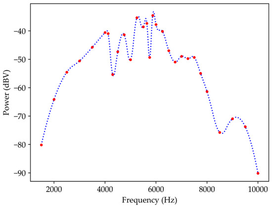 The response of this sensor when in contact with a periodical oscillating surface has also been studied. The amplitude of the mechanical oscillation of the surface was less than 0.5 mm. In this characterization, the sensor was placed in two positions, parallel and perpendicular, to the vibration generator. In the first case, the schema of Figure 4a was used, and resulted are shown in Figure 10, which presents the relationship between the electrical power and the frequency. For this purpose, the interrogation system was the photodetector and the intensity was converted into electrical power. The result of the sensor subject to vibration shows a similar response to a bandpass, i.e., for low frequencies below 1.5 kHz, the sensor was insensitive. In the flat region, the sensor shows several resonances resulting from the system used for the sensor characterization. Above 7 kHz there was a strong drop due to the limitation of the vibration generator.