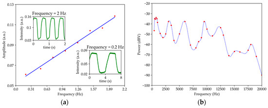 For the case of Figure 4b, where the sensor is perpendicular to the oscillating surface, Figure 11a,b shows the system response to low frequencies and the bandwidth between 400 Hz to 20 kHz. For frequencies between 0.2 Hz and 2 Hz (Figure 11a), the amplitude of the optical signal increases with increasing frequency, in addition to containing the mechanical oscillation frequency. However, the optical signal was saturated because the sensor was fixed by the optical fiber. When the tip arrives to the maximum curvature, the fiber starts to bend. The sensitivity for the frequency range under study is 0.032 ± 0.001 (Hz−1). For frequencies between 400 Hz and 20 kHz (see Figure 11b) present more sensitivity when compared to the parallel mode. However, higher resonances are presented with a similar maximum spectra power response due to the resonance of the tip.