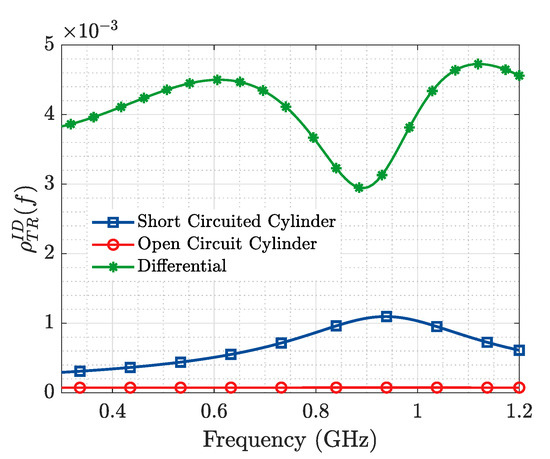 Figure 2 represents the frequency response, between 0.3 and 1.2 GHz where a single resonance may be considered, of the Tx-ID-Rx system through the relation, , for two states: (a) short-circuited ( 0.0), where the ID is supposed to work properly as a 20 mm cylindrical continuous element, and (b) open-circuited ( 1000), where the ID is supposed to be broken in the middle as two shorter 10 mm elements in which the actual value of 10 mm represents the remaining structural backscattering.
