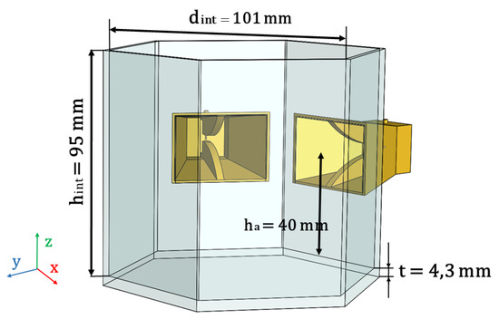 This hexagonal set up has been manufactured in PLA (polylactic acid) using 3D printing technology to perfectly host the horns. The hexagonal shape allows to recreate the layout the antennas would have in an in vivo scenario. The dimensions of the hexagonal box are: inner diameter mm, inner height mm, wall thickness mm and 35 mm height from the bottom of the set up to the antenna.