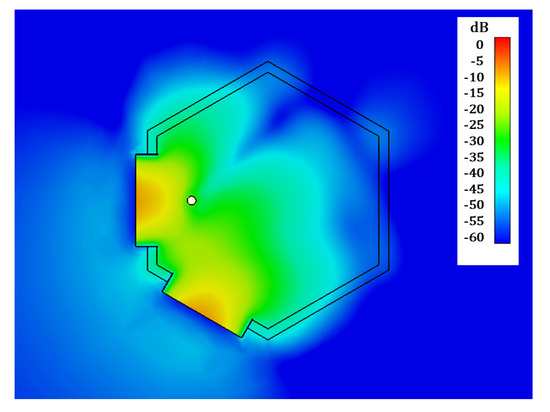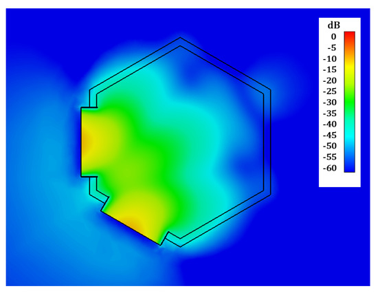 In Figure 4 and Figure 5 the simulated joint E-field distribution of both horn antennas, transverse to the aperture plane of the antennas, is represented at 0.8 GHz (estimated resonance frequency of the considered ID) for the case when no implant is present in the scenario (Figure 4), and for an implanted device placed in front of the aperture of one of the antennas (Figure 5), clearly showing the influence of the implant. We can also observe the necessity of placing the probe antennas in such a way that the implant is located inside the crossing region of the field distribution radiated by both (Tx and Rx) antennas, which contributes to ID sensing.