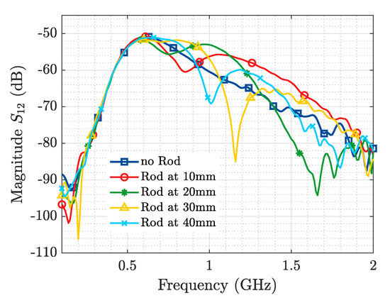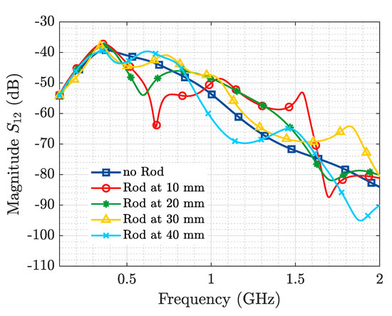 The results exhibited in this section correspond to the simulation/experimental measurement of an alumina rod of 24 mm length and 4 mm diameter (parallel to the E-field radiated by the horn antennas) for different positions along the y axis (see Figure 3), as a mean to asses the variation introduced by the resonant object in the scattering matrix ([S]) of the Tx and Rx antennas. Baseline results (no Rod) for the medium without the ID are also included. These measurements exhibit a repeatability error, computed according to the standard deviation of the mean, below 0.04 within the frequency band of interest.