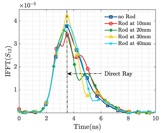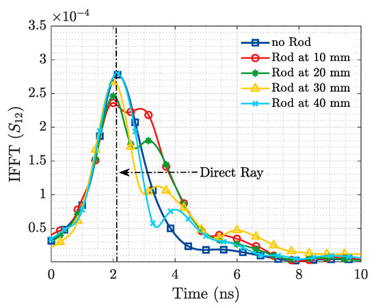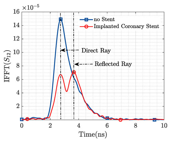 From Figure 11, it is observed that we are able to detect the presence of the ID from the information in the magnitude of the transmission coefficient, while Figure 12 displays in the time domain the reflection produced by the presence of the stent. Based on the results of Figure 11 and Figure 12, and the geometry of the applied probes in Figure 10, an approximate depth of 3 cm with respect to the plane of the horn antennas may be estimated.