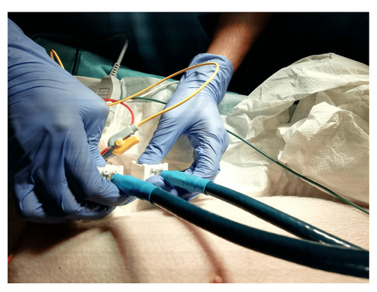 After validating the applicability of the resonance-based microwave technique for body implant sensing with simulations and experimental measurements, we were able to test its performance in an in vivo scenario. A swine animal implanted with a coronary stent has been measured using the aforementioned procedure. Figure 10 depicts the display of the antennas on the side of the pig’s rib cage, aiming to the implanted stent, with a bistatic geometry equivalent to the one in Figure 3.