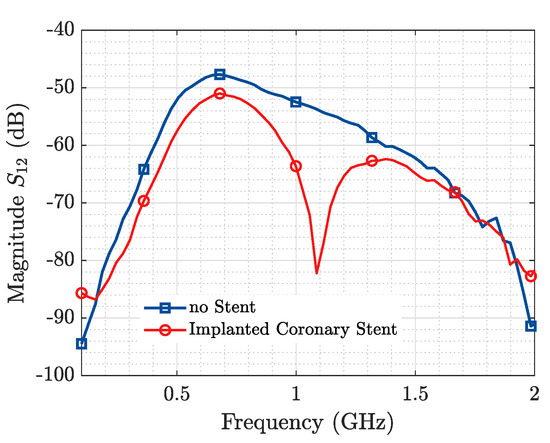 These IDs may change some characteristics over time in such a way that their functionality may be compromised. These changes may be triggered by wear corrosion, breakdowns, adherence of biological tissues, etc. This would most likely result in operational malfunctioning and, in most cases, a change in its electrical parameters, which will result in a change of its resonant frequency. Examples of these IDs may include metal stents (usually covered by drug-eluding substances) [2], which currently are the preferred solution for the treatment of IHD (Ischemic Heart Disease) [3], pins and screws in orthopedics and craniofacial surgery, and artificial joints [4,5], with typical lengths ranging from 1 to 30 cm. These, when implanted in regions of the human body with permittivities between 4 and 57, produce a resonance in the UHF region.