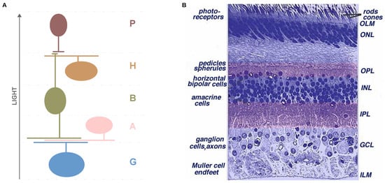 Anatomy of the retina. (A) Schematic diagram of the connections between the basic cell classes—photoreceptors (P), horizontal cells (H), bipolar cells (B), amacrine cells (A) and ganglion cells (G). Light rays must reach the sensory cells, the photoreceptors, passing through the entire retina. (B) Light micrograph of a vertical section of the central human retina (adapted from Webvision []).