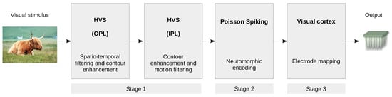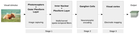 Several computational models have been proposed to imitate the behaviour of the vertebrate retina from the single cell to the network level. Simoncelli et al. proposed a method for the characterisation of the functional relationship between environmental stimuli and their neural responses, using the concept of the receptive field. This model combines a linear spatiotemporal filter of single static nonlinearity []. Paninski et al. proposed statistical model-based techniques that provide a unified solution to the encoding problem (how information is encoded in neural spike trains) and the decoding problem (how much information is encoded in a spike train) []. Pillow et al. analysed the functional significance of correlated firing in a complete population of macaque parasol retinal ganglion cells using a multi-neuron spike response model []. Nirenberg et al. presented a data-driven model of retinal input–output relationships that is effective on a broad range of stimuli [,,]. This prosthetic system converts visual input into the same patterns of action potentials that the retina normally produces. It reliably reproduces those patterns for a broad range of stimuli, including faces, landscapes and animals. Wohrer and Kornprobst proposed a computational simulation software, called Virtual Retina, which performs large-scale simulations of high biological plausibility []. Cessac et al. extended the range of retina simulation software with a new platform that integrates the retina simulator and a toolbox for the analysis of spike train population statistics []. Huth et al. published Convis, a Python simulation toolbox for large-scale neural populations, which offers luminance gain control, contrast gain control and arbitrary receptive fields by 3D convolutions executed on a graphics card []. Martínez-Álvarez et al. proposed a compiler-based framework capable of describing, simulating and validating customized retina models []. Martínez-Cañada et al. proposed a set of computational retinal microcircuits that can be used as basic building blocks for the modelling of different retina mechanisms []. Recently, deep convolutional neural networks were shown to capture retinal responses to natural scenes, with results that were close to the variability of the cellular response range [,], as well as multitask recurrent neural networks that provided the necessary flexibility to model complex neuronal computations [].